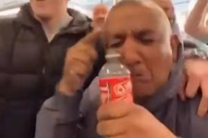 嘲讽升级!曼城球迷“水瓶哥”拧开阿森纳标志水瓶,开始接眼泪